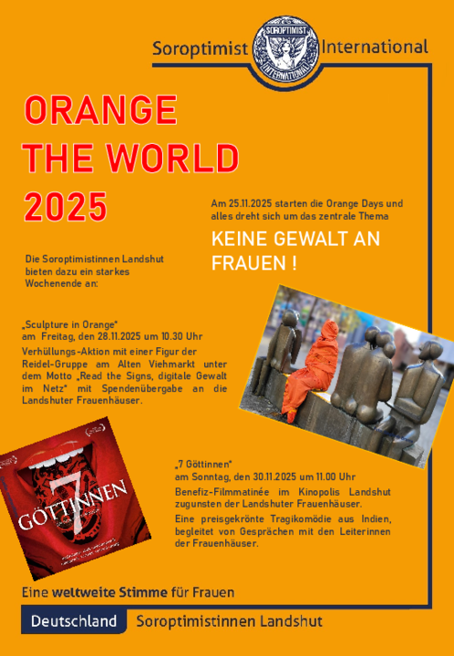 Am 25.11.2025, dem Internationalen Tag gegen Gewalt an Frauen, starten die Orange Days, die am 10.12.2025, dem Tag der Menschenrechte, enden. In diesem Zeitraum dreht sich alles um das zentrale Thema STOPP KEINE GEWALT AN FRAUEN!, zu dem weltweit zahlreiche Veranstaltungen stattfinden. Der Soroptimist-Club Landshut bietet dazu ein starkes Wochenende an: