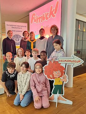 vo.li.: Gabriella von Nostitz (Projektbeauftragte) und Dr. Margit Staudinger-Pfeffer (Präsidentin) vom Soroptimist-Club Landshut, Silvia Betz ( stv. Schulleiterin HCG), Doros Danzer (Museumspädagogin), Yvonne Löken (Klassenleiterin/Initiatoren des Projekts) mit einer begeisterten Schülerklasse der Deutschklasse