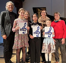 vo.li.:Musikschulleiter Peter Papritz (hinten, von links); AG-Leiterin Gaby Schramm, Präsidentin Margit Staudinger-Pfeffer, Hilfsfonds-Delegierte Anita Drexler Soroptimist-Club; sowie die drei Stipendiatinnen (vorne, von links) Ida Schuster, My