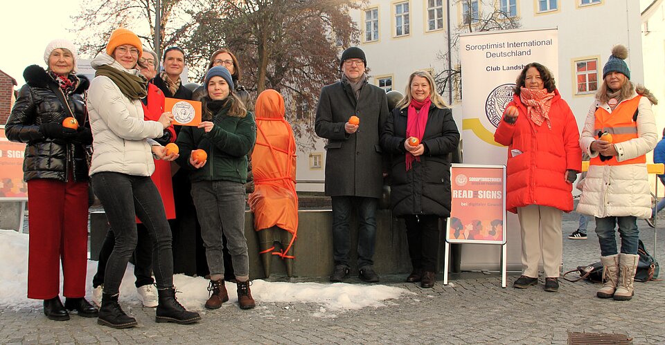 Im Rahmen der Orange Days verhüllte der Soroptimist-Club Landshut eine Frauenfigur des Bildhauers Karl Reidel, um ein sichtbares Zeichen gegen Gewalt an Frauen zu setzen – und als Teil der europaweiten Kampagne „Read the signs“ besonders auf digitale Gewalt gegen Frauen und Mädchen im Netz aufmerksam zu machen, unterstützt von Gästen aus Politik und interessierten LandshuterInnen.